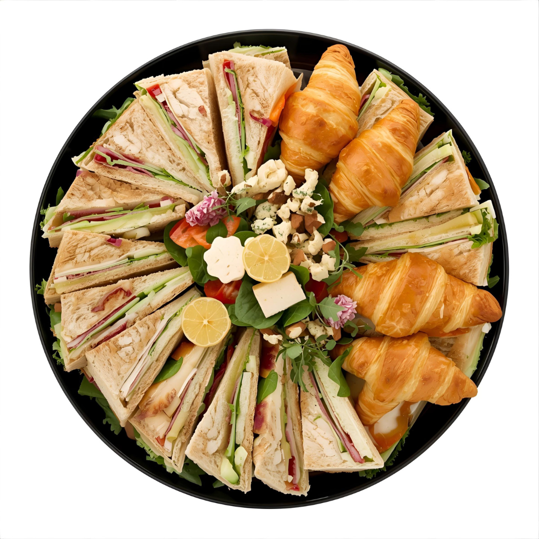 Freshly stacked croissants and sandwiches, filled with a variety of delicious ingredients for a crowd-pleasing bite. Perfect for office meetings, brunches, or casual gatherings. (Serves 10-12)